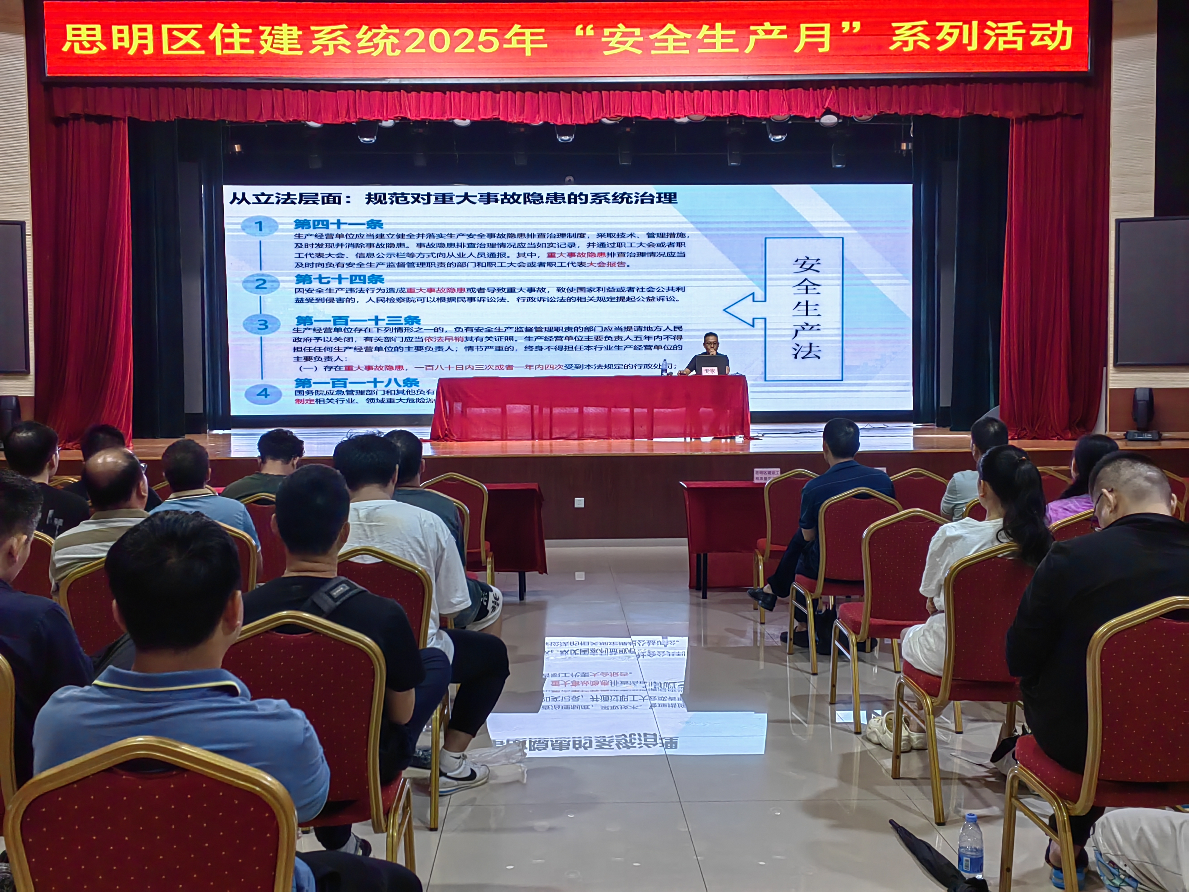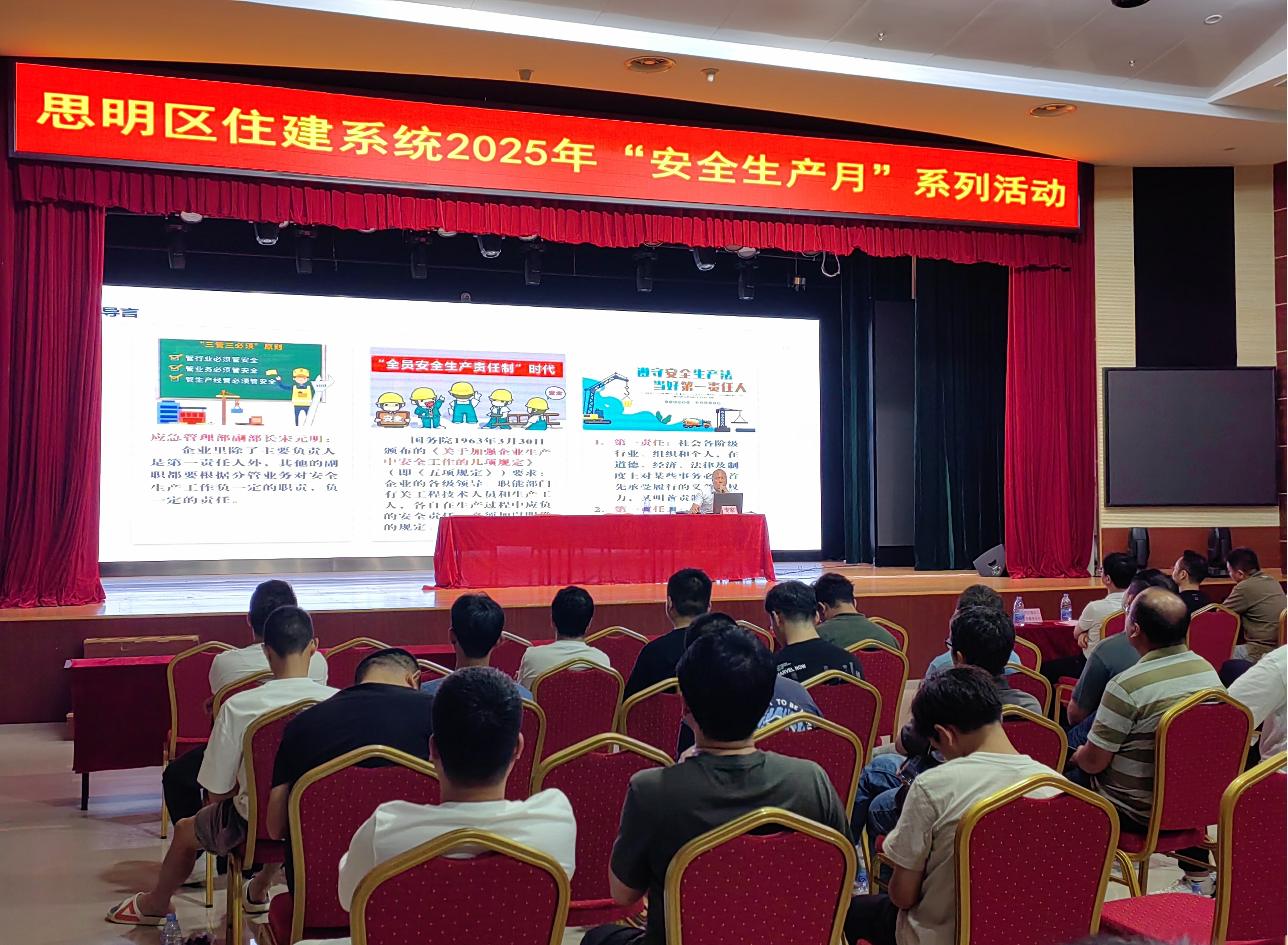 为深入贯彻习近平总书记关于安全生产的重要论述,全面落实国家、省、市对“安全生产月”活动的部署,2025年07月11日下午由厦门市思明区住房和建设局主办,我司协办的厦门市思明区住建系统2025年“安全生产月”系列活动暨预防高坠安全管理和建筑起重机械重大隐患判定及预防培训在厦门市工人文化宫105报告厅圆满举行。